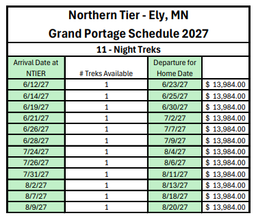 Grand portage trips are subject to availability within the Fort Charlotte Campsite. Once you register your crew, Northern Tier will reserve a site for you at Fort Charlotte through the National Park. Once we have your confirmation from the park, we will inform you that your trip has been confirmed. Should there be no availability at Fort Charlotte, we will work with you to adjust your itinerary if possible; otherwise, you would be eligible for a full refund or transfer of fees to another Northern Tier trek.