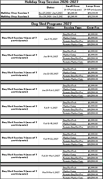 - May 1, 2024: 100% Dog Sled and Holiday Stay Fees Due